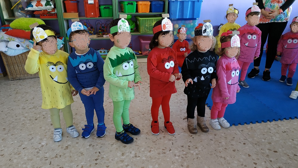 Las educadoras de las clases de 2 años de nuestra escuela se han basado en el libro «El Monstruo de Colores» de Anna Llenas para hacer los disfraces de los alumnos y alumnas y realizar el Pasacalles con las familias.